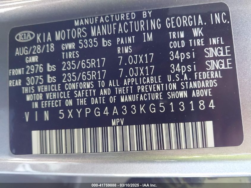 2019 KIA SORENTO 2019 Gasoline, 2.4, Front wheel drive, VIN - 5XYPG4A33KG****** from the USA