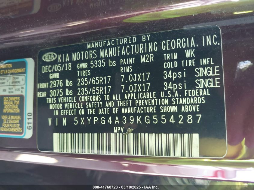 2019 KIA SORENTO 2019 Gasoline, 2.4, Front wheel drive, VIN - 5XYPG4A39KG****** from the USA