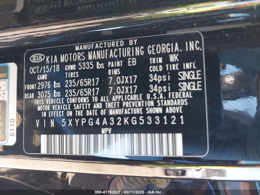 2019 KIA SORENTO 2019 Gasoline, 2.4, Front wheel drive, VIN - 5XYPG4A32KG****** from the USA