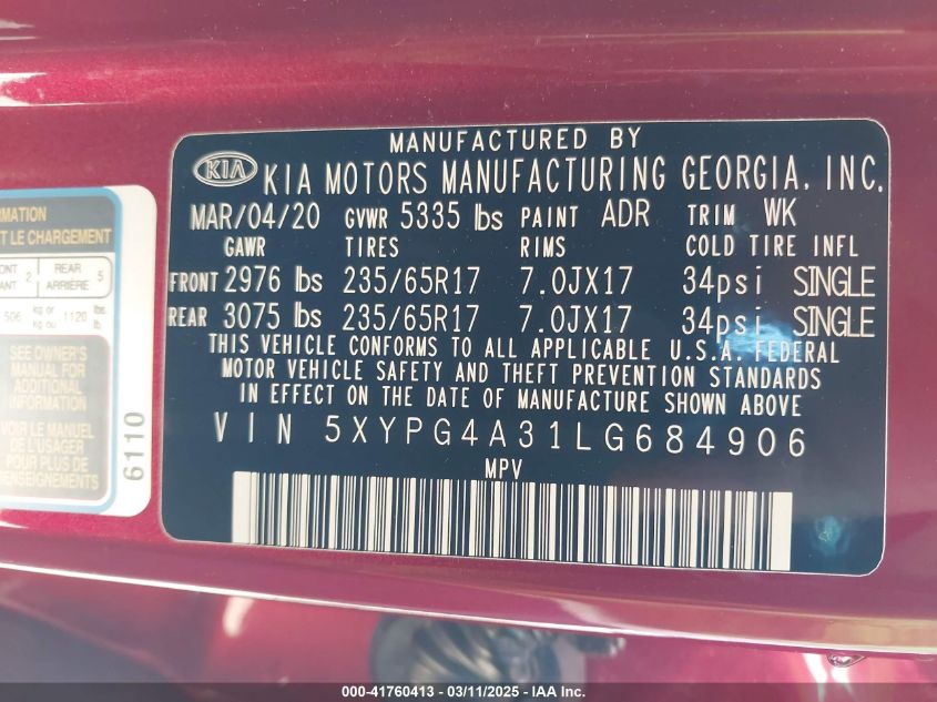 2020 KIA SORENTO 2020 Gasoline, 2.4, Front wheel drive, VIN - 5XYPG4A31LG****** from the USA