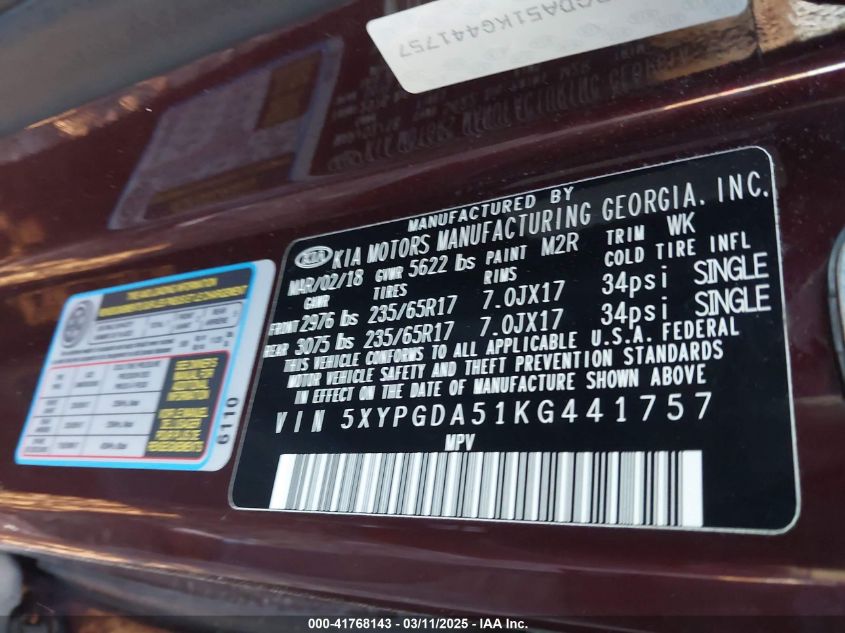 Color BurgundyCylinders 6Drive Full driveVIN 5XYPGDA51KG******State Run & Drive VerifiedDamage Front or back AutoRIA