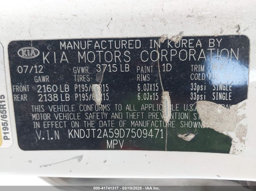Color WhiteCylinders 4Drive Front wheel driveVIN KNDJT2A59D7******State Run & Drive VerifiedDamage Front rightAuction date 2025-03-20 AutoRIA