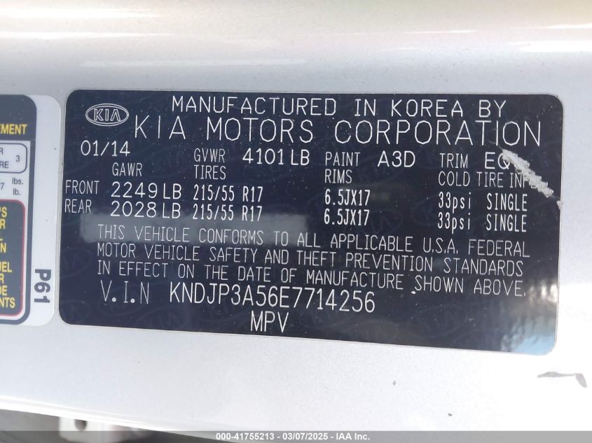 Color BlackCylinders 4Drive Front wheel driveVIN KNDJP3A56E7******State Run & Drive VerifiedDamage VandalismAuction date 2025-03-20 AutoRIA