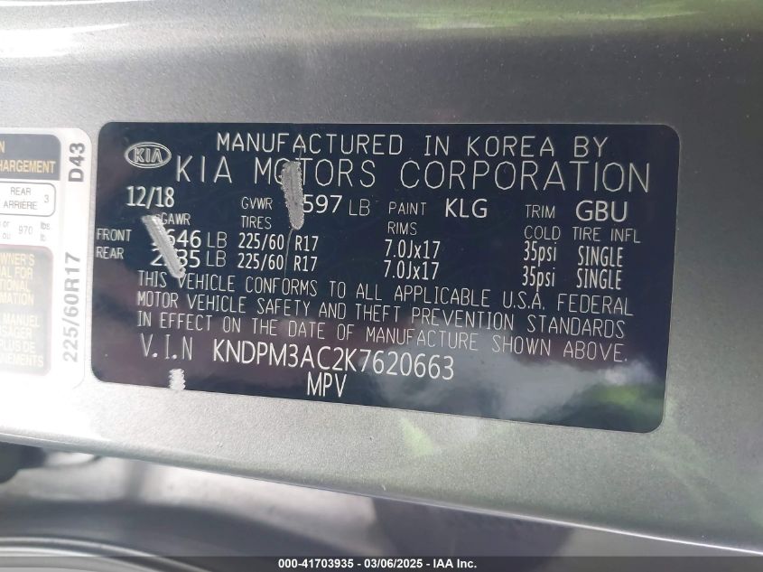 Color GrayCylinders 4Drive Front wheel driveVIN KNDPM3AC2K7******State Run & Drive VerifiedDamage Front or back AutoRIA
