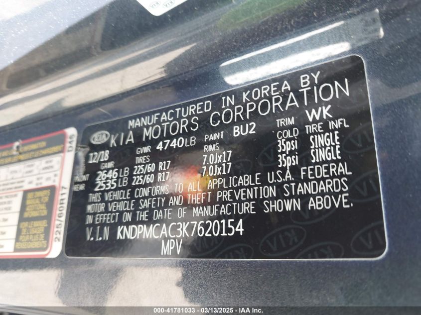 Color BlueCylinders 4Drive Full driveVIN KNDPMCAC3K7******State Run & Drive VerifiedDamage Vandalism AutoRIA