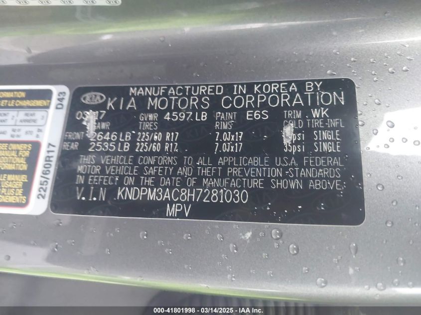Color GrayCylinders 4Drive Front wheel driveVIN KNDPM3AC8H7******State Run & Drive VerifiedDamage Vandalism AutoRIA