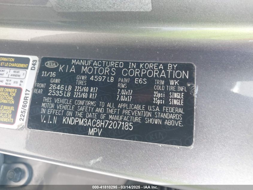 Color GrayCylinders 4Drive Front wheel driveVIN KNDPM3AC8H7******State Run & Drive VerifiedDamage Vandalism AutoRIA