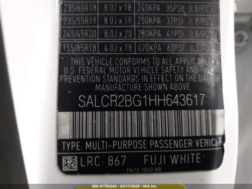 Color WhiteCylinders 4Drive Full driveVIN SALCR2BG1HH******State Run & Drive VerifiedDamage Front or back AutoRIA