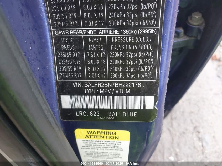 Color BlueCylinders 6Drive Full driveVIN SALFR2BN7BH******State Run & Drive VerifiedDamage Right side