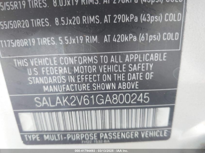 Color GrayCylinders 6Drive Full driveVIN SALAK2V61GA******State Run & Drive VerifiedDamage It is unknownAuction date 2025-03-24