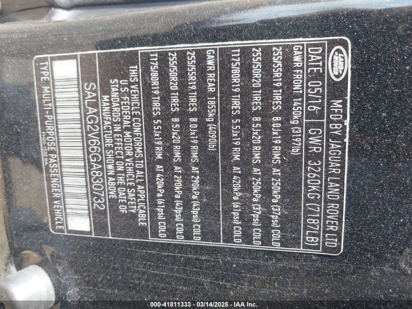 Color BlackCylinders 6Drive Full driveVIN SALAG2V66GA******State Run & Drive VerifiedDamage InsignificantAuction date 2025-03-27