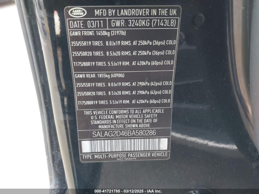 Color BlackCylinders 8Drive Full driveVIN SALAG2D46BA******State Run & Drive VerifiedDamage Front or back