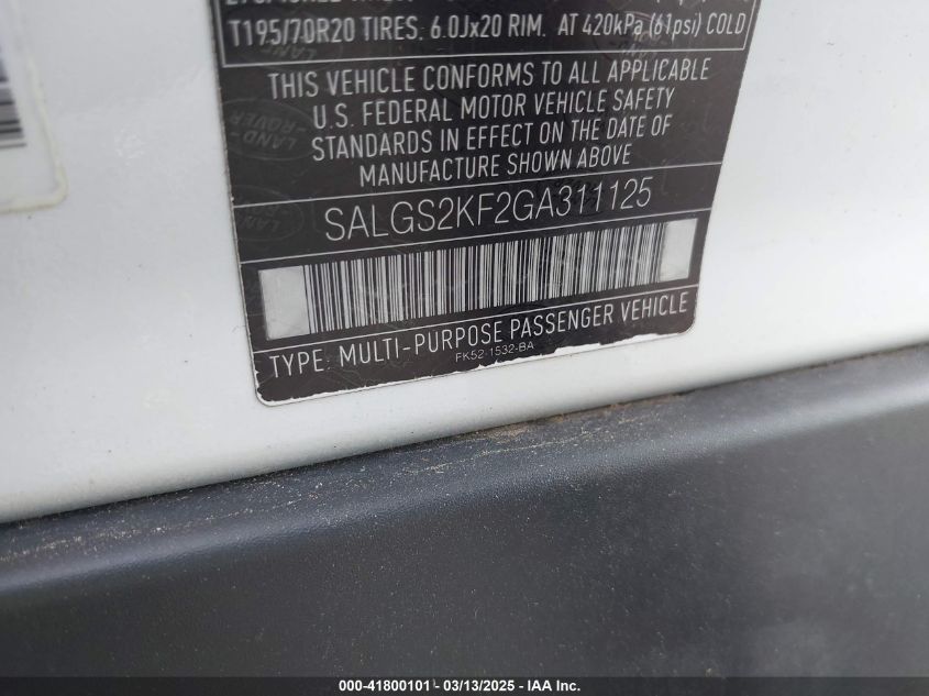 Color WhiteCylinders 6Drive Full driveVIN SALGS2KF2GA******State Run & Drive VerifiedDamage InsignificantAuction date 2025-03-26 AutoRIA