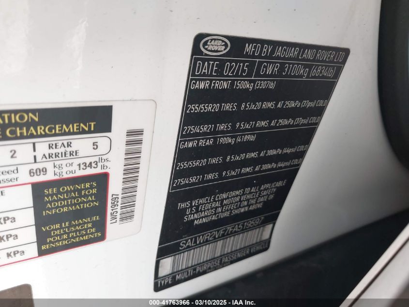 Color WhiteCylinders 6Drive Full driveVIN SALWR2VF7FA******State Run & Drive VerifiedDamage InsignificantAuction date 2025-03-26 AutoRIA