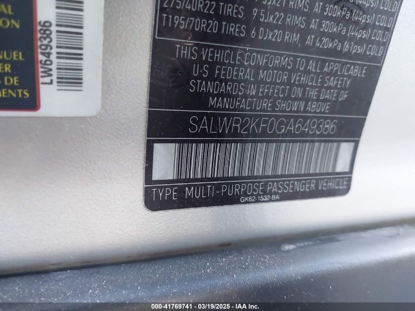 Color SilverCylinders 6Drive Full driveVIN SALWR2KF0GA******State Run & Drive VerifiedDamage Water AutoRIA