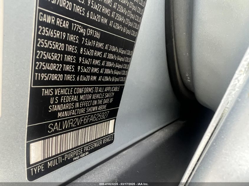 Color SilverCylinders 6Drive Full driveVIN SALWR2Vf6FA******State Run & Drive VerifiedDamage InsignificantAuction date 2025-03-26 AutoRIA