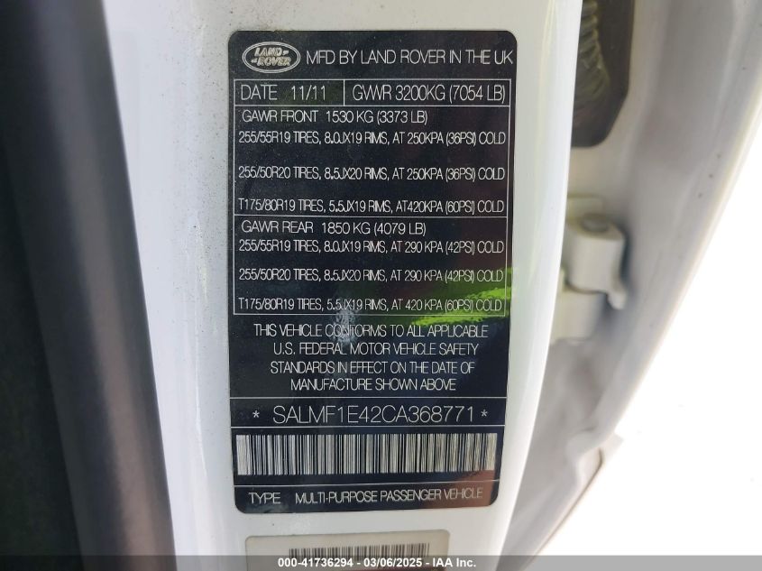 Color WhiteCylinders 8Drive Full driveVIN SALMF1E42CA******State Run & Drive VerifiedDamage InsignificantAuction date 2025-03-25 AutoRIA