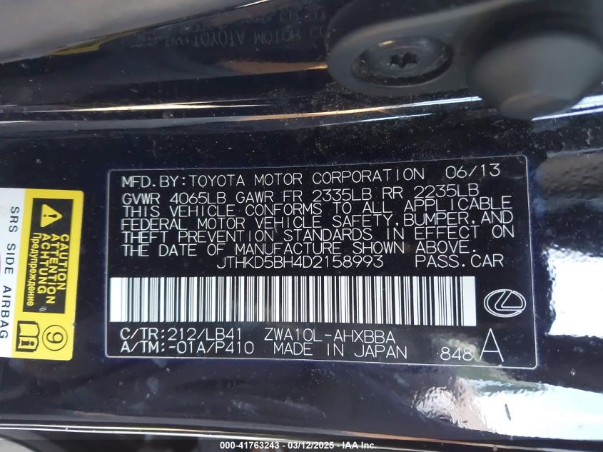 2013 LEXUS CT 200H 2013 Hybrid, 1.8, Front wheel drive, VIN - JTHKD5BH4D2****** from the USA