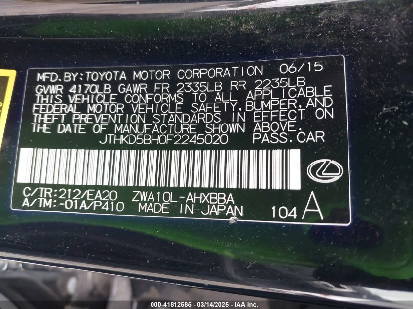 2015 LEXUS CT 200H 2015 Hybrid, 1.8, Front wheel drive, VIN - JTHKD5BH0F2****** from the USA