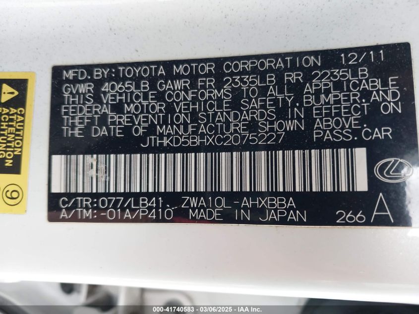 2012 LEXUS CT 200H 2012 Hybrid, 1.8, Front wheel drive, VIN - JTHKD5BHXC2****** from the USA