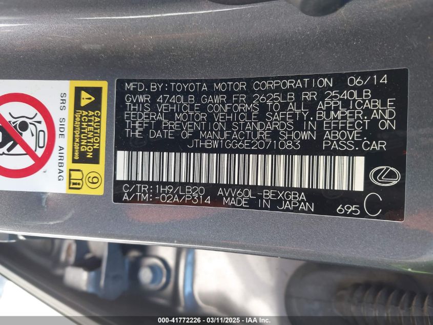 Color GrayCylinders 4Drive Front wheel driveVIN JTHBW1GG6E2******State Run & Drive VerifiedDamage Left side AutoRIA