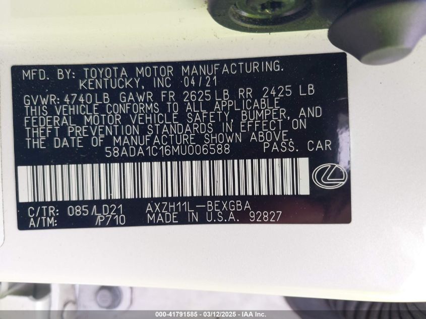 2021 LEXUS ES 300H 2021 Hybrid, 2.5, Front wheel drive, VIN - 58ADA1C16MU****** from the USA