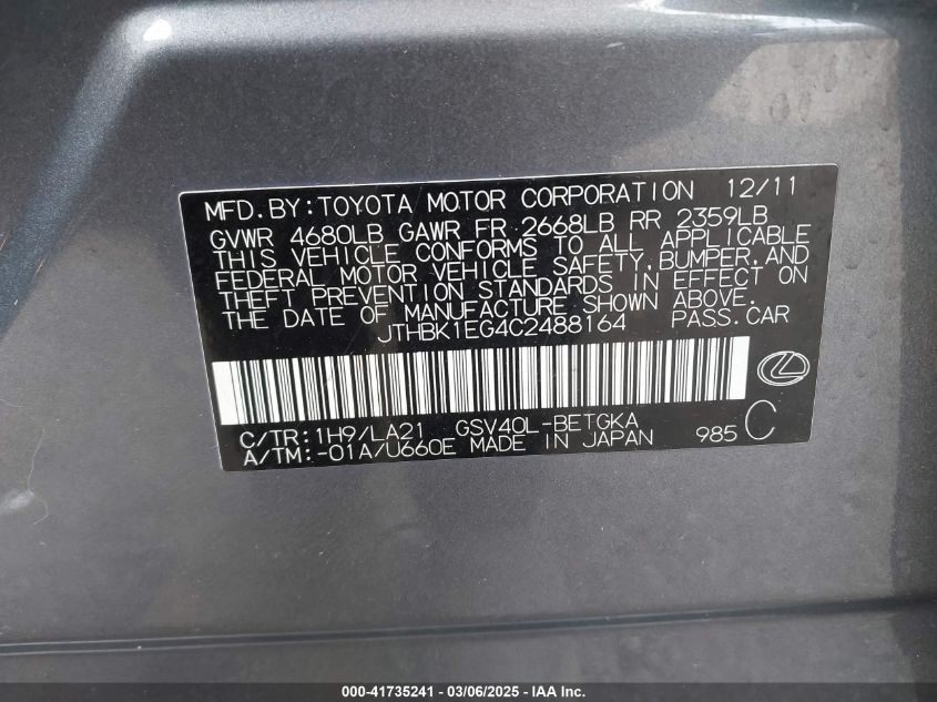 2012 LEXUS ES 350 2012 Gasoline, 3.5, Front wheel drive, VIN - JTHBK1EG4C2****** from the USA