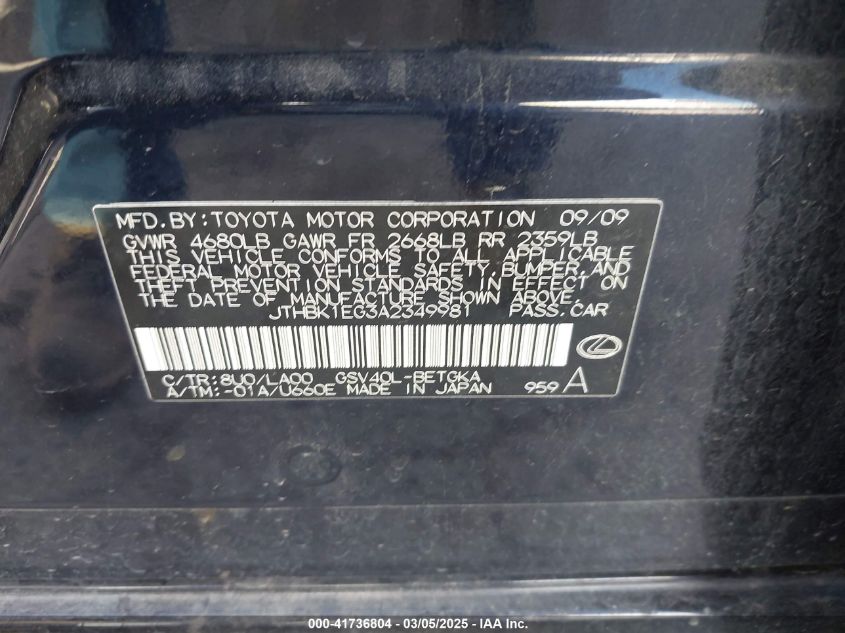 Color BlueCylinders 6Drive Front wheel driveVIN JTHBK1EG3A2******State Run & Drive VerifiedDamage Front rightAuction date 2025-03-24 AutoRIA