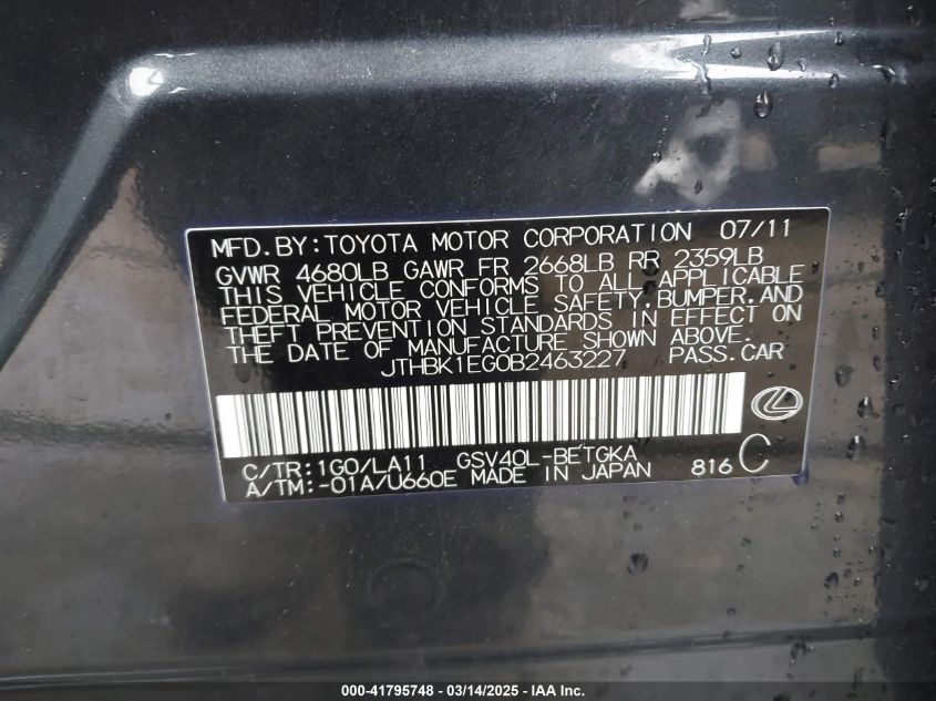 2011 LEXUS ES 350 2011 Gasoline, 3.5, Front wheel drive, VIN - JTHBK1EG0B2****** from the USA