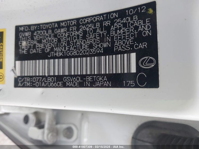 Color WhiteCylinders 6Drive Front wheel driveVIN JTHBK1GG8D2******State Run & Drive VerifiedDamage Rear left AutoRIA