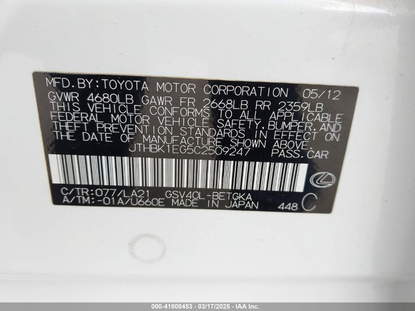 Color WhiteCylinders 6Drive Front wheel driveVIN JTHBK1EG5C2******State Run & Drive VerifiedDamage Right side AutoRIA