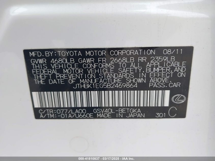 2011 LEXUS ES 350 2011 Gasoline, 3.5, Front wheel drive, VIN - JTHBK1EG5B2****** from the USA