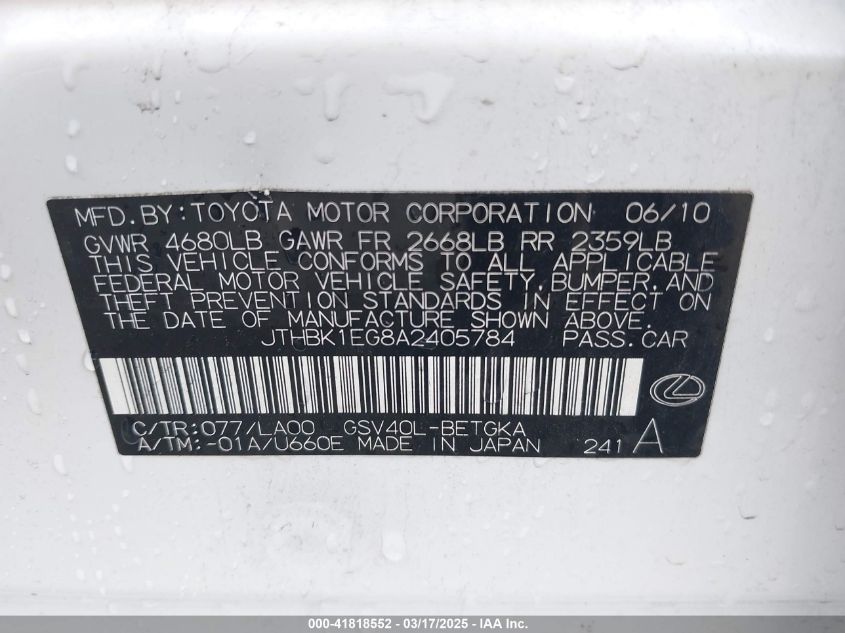Color WhiteCylinders 6Drive Front wheel driveVIN JTHBK1EG8A2******State Run & Drive VerifiedDamage Left side AutoRIA