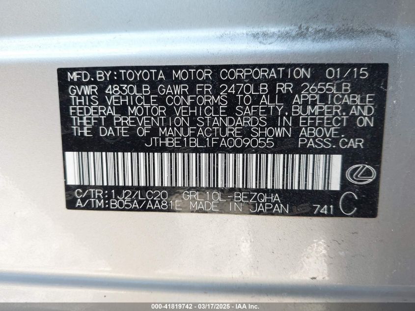 Color SilverCylinders 6Drive Rear wheel driveVIN JTHBE1BL1FA******State Run & Drive VerifiedDamage Front or backAuction date 2025-03-21 AutoRIA