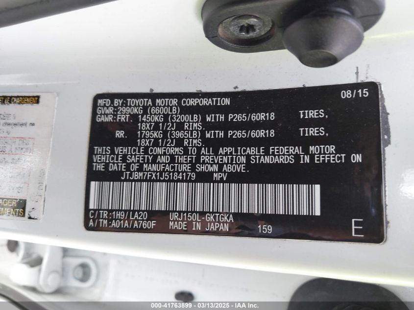 Color WhiteCylinders 8Drive Full driveVIN JTJBM7FX1J5******State Run & Drive VerifiedDamage It is unknownAuction date 2025-03-20 AutoRIA