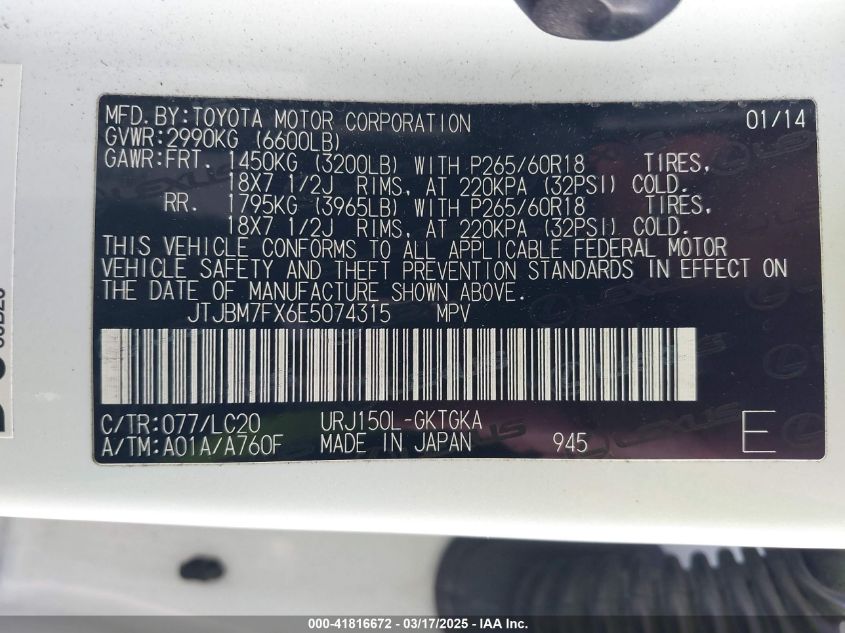 Color WhiteCylinders 8Drive Full driveVIN JTJBM7FX6E5******State Run & Drive VerifiedDamage Front leftAuction date 2025-03-21 AutoRIA