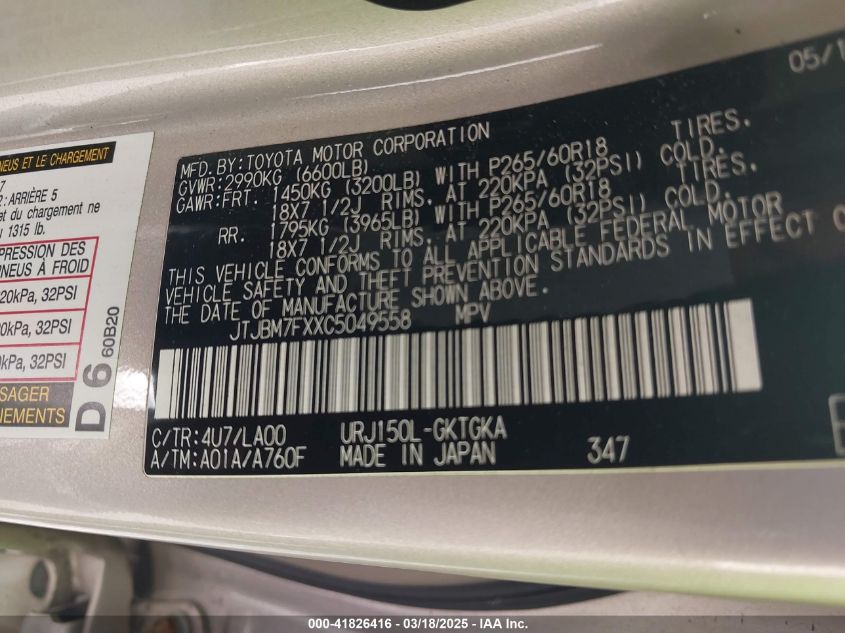 Color GoldCylinders 8Drive Full driveVIN JTJBM7FXXC5******State Run & Drive VerifiedDamage Front or back AutoRIA