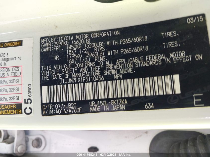 Color WhiteCylinders 8Drive Full driveVIN JTJJM7FX1F5******State Run & Drive VerifiedDamage Front or back AutoRIA