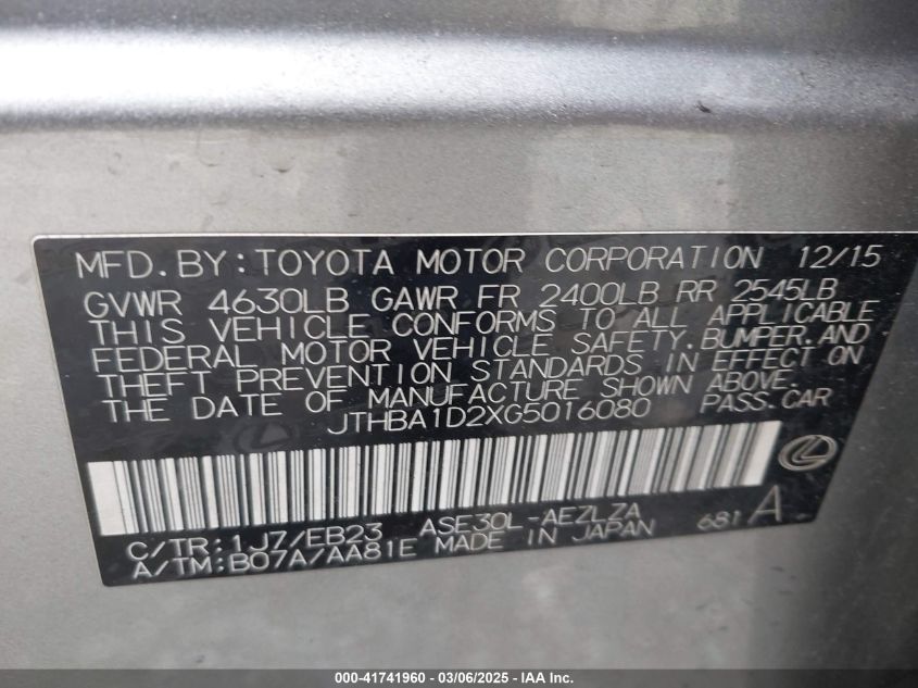 2016 LEXUS IS 200T 2016 Gasoline, 2.0, Rear wheel drive, VIN - JTHBA1D2XG5****** from the USA