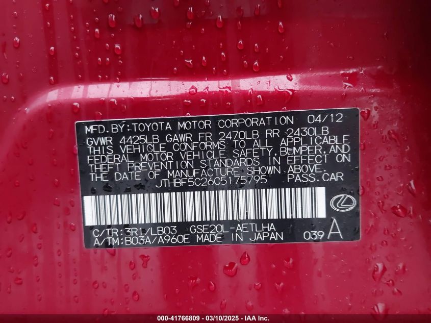 Color BurgundyCylinders 6Drive Rear wheel driveVIN JTHBF5C26C5******State Run & Drive VerifiedDamage Front or backAuction date 2025-03-25 AutoRIA