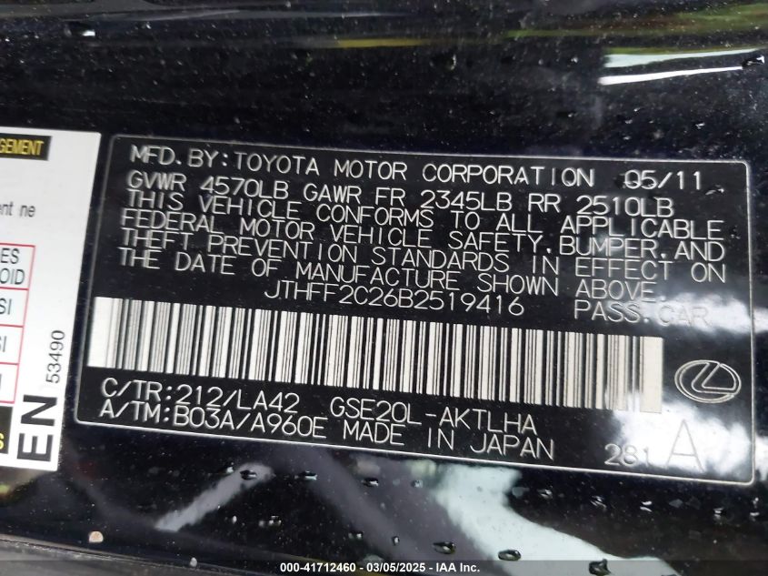 Color BlackCylinders 6Drive Rear wheel driveVIN JTHFF2C26B2******State Run & Drive VerifiedDamage Front or backAuction date 2025-03-26