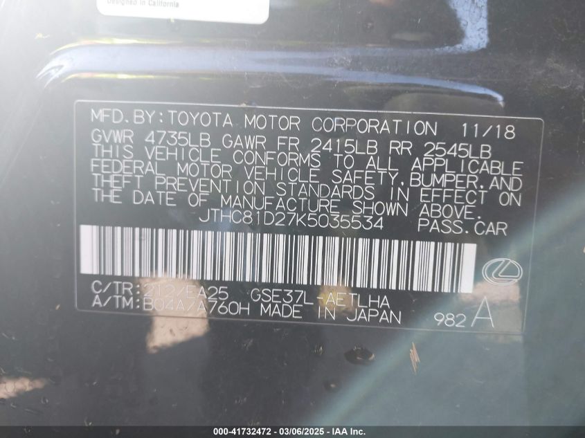 2019 LEXUS IS 300 2019 Gasoline, 3.5, Full drive, VIN - JTHC81D27K5****** from the USA