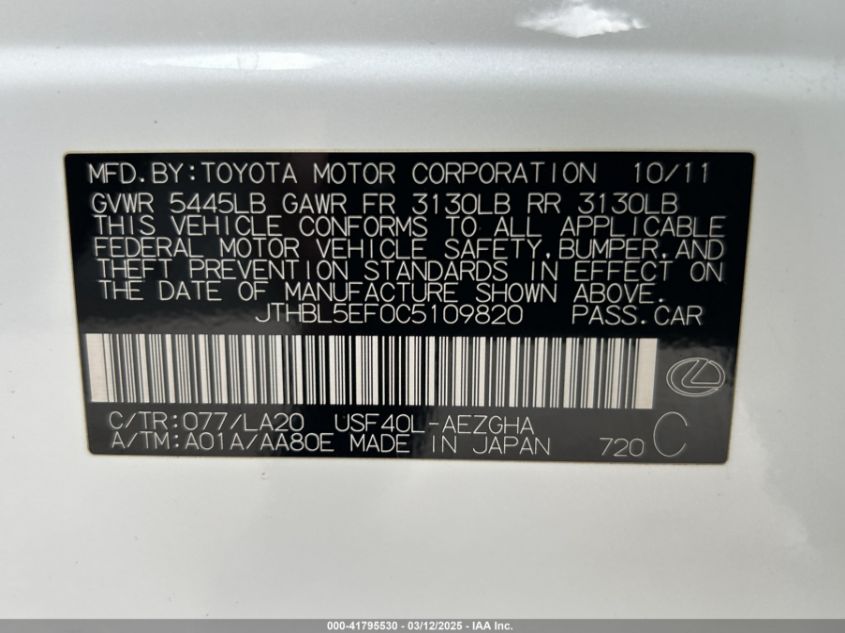 Color WhiteCylinders 8Drive Rear wheel driveVIN JTHBL5EF0C5******State Run & Drive VerifiedDamage InsignificantAuction date 2025-03-20 AutoRIA