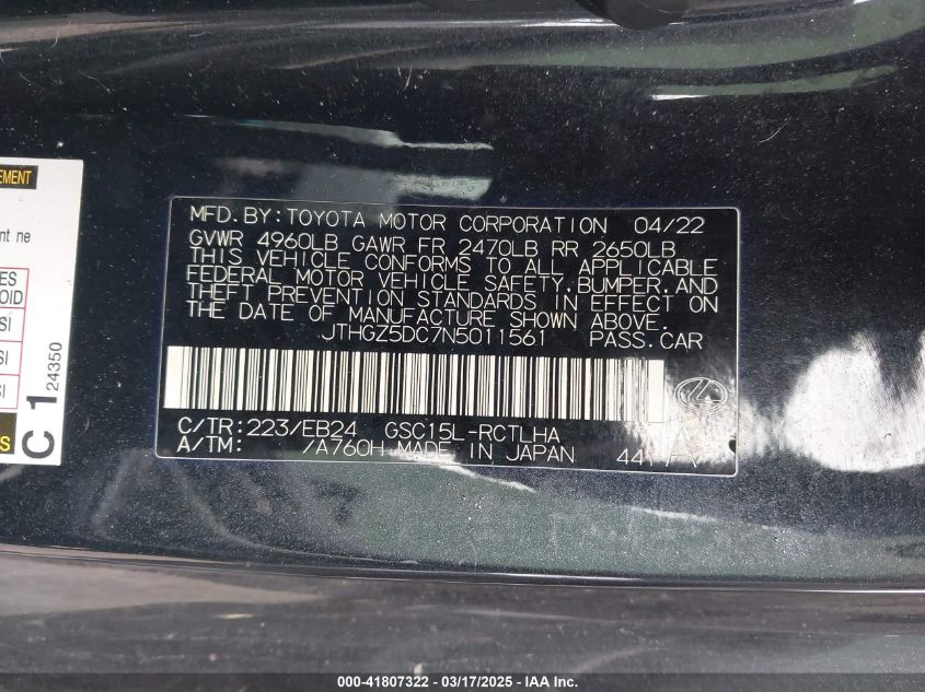 Color BlackCylinders 6Drive Full driveVIN JTHGZ5DC7N5******State Run & Drive VerifiedDamage Right side
