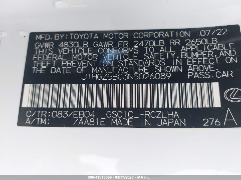 Color WhiteCylinders 6Drive Rear wheel driveVIN JTHGZ5BC3N5******State Run & Drive VerifiedDamage Back
