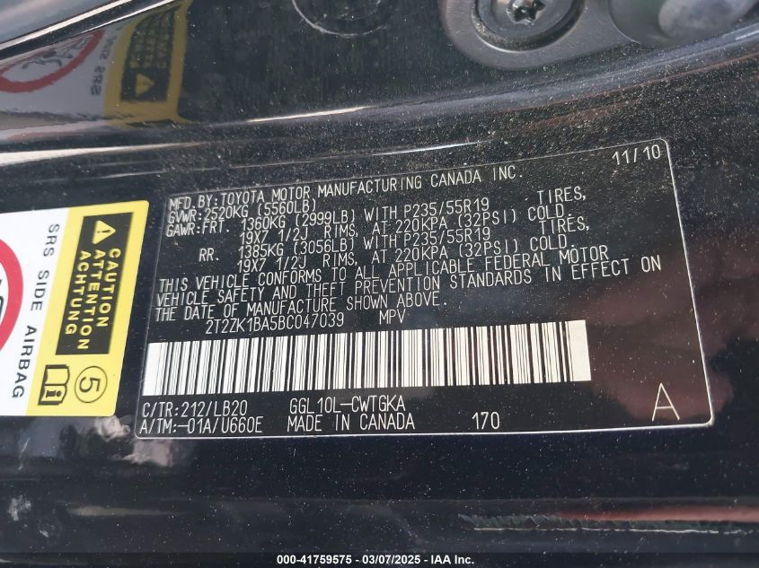 Color BlackCylinders 6Drive Front wheel driveVIN 2T2ZK1BA5BC******State Run & Drive VerifiedDamage InsignificantAuction date 2025-03-20 AutoRIA