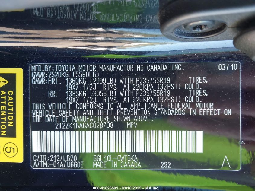 Color BlackCylinders 6Drive Front wheel driveVIN 2T2ZK1BA6AC******State Run & Drive VerifiedDamage Front or back AutoRIA