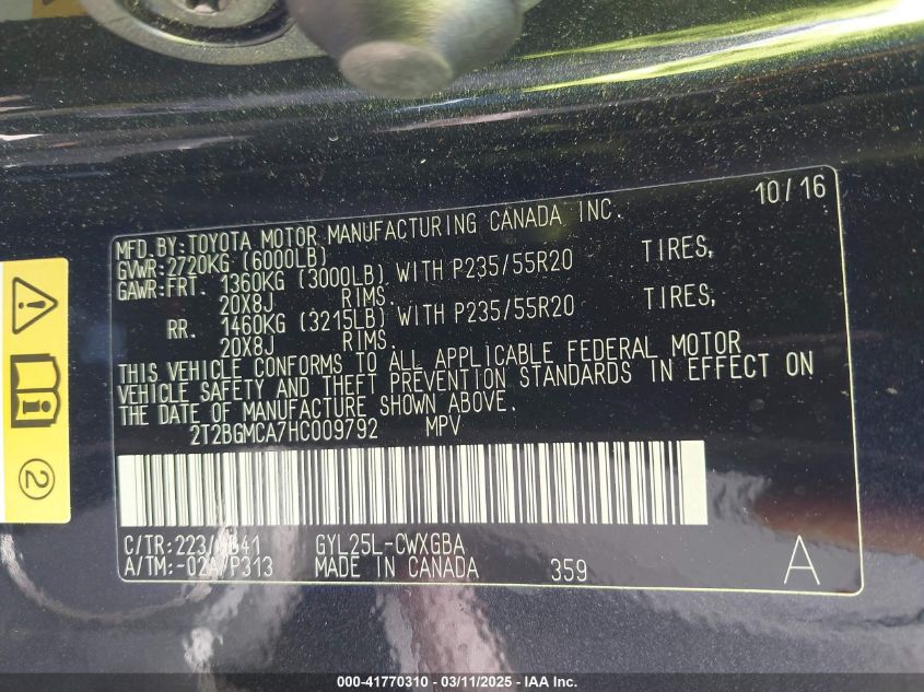 Color BlackCylinders 6Drive Full driveVIN 2T2BGMCA7HC******State Run & Drive VerifiedDamage Right side AutoRIA