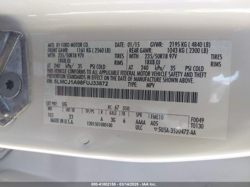 2015 LINCOLN MKC 2015 Gasoline, 2.0, Front wheel drive, VIN - 5LMCJ1A98FU****** from the USA