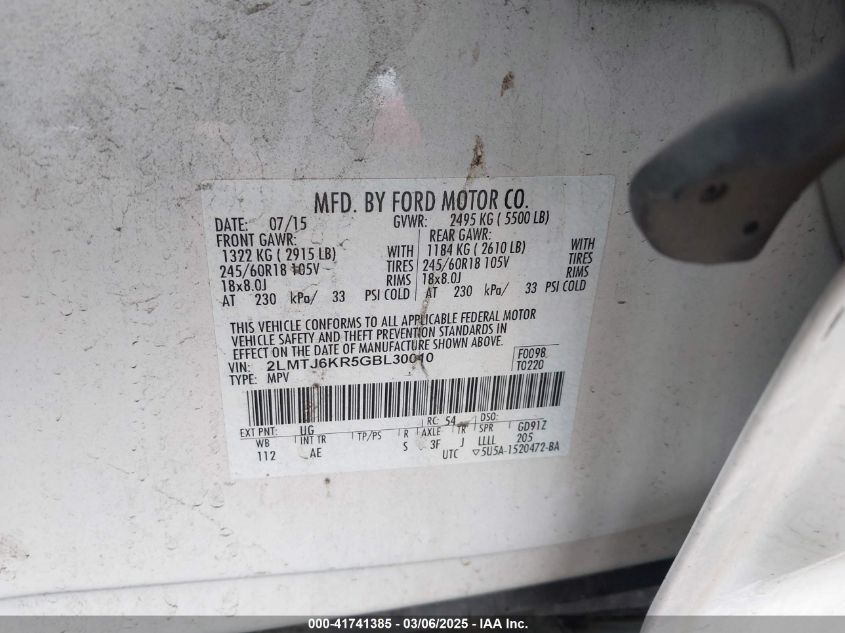 Color WhiteCylinders 6Drive Front wheel driveVIN 2LMTJ6KR5GB******State Run & Drive VerifiedDamage Left sideAuction date 2025-03-21 AutoRIA